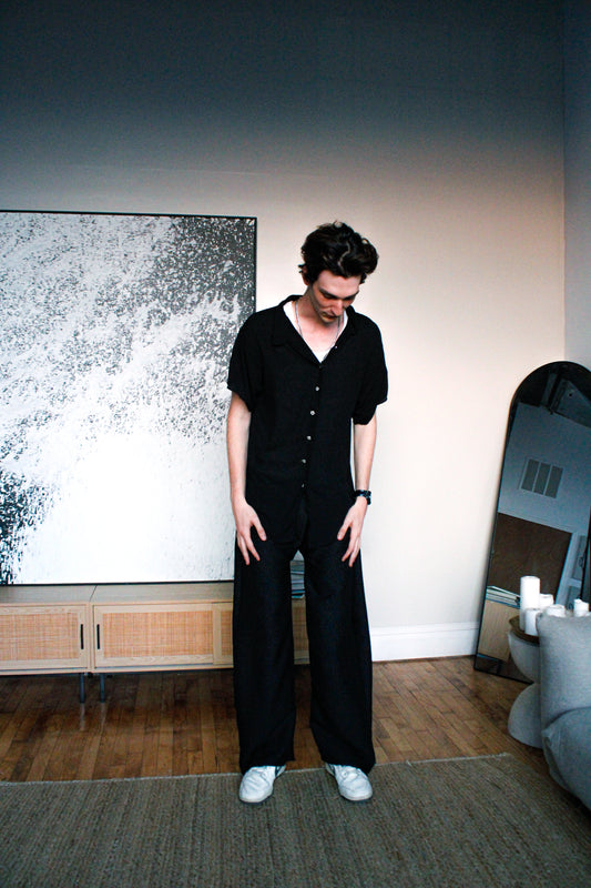 black silk button-up X jorts