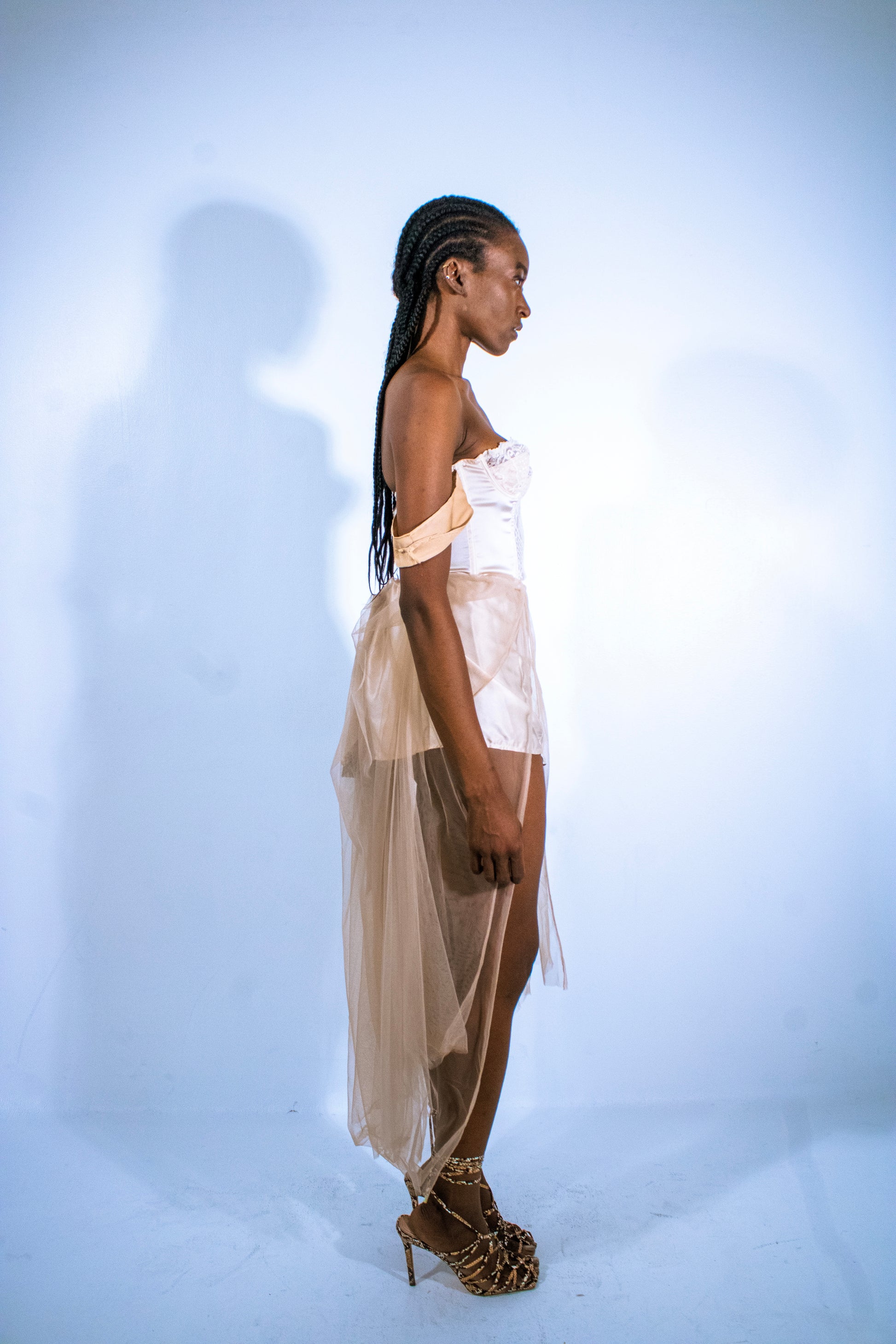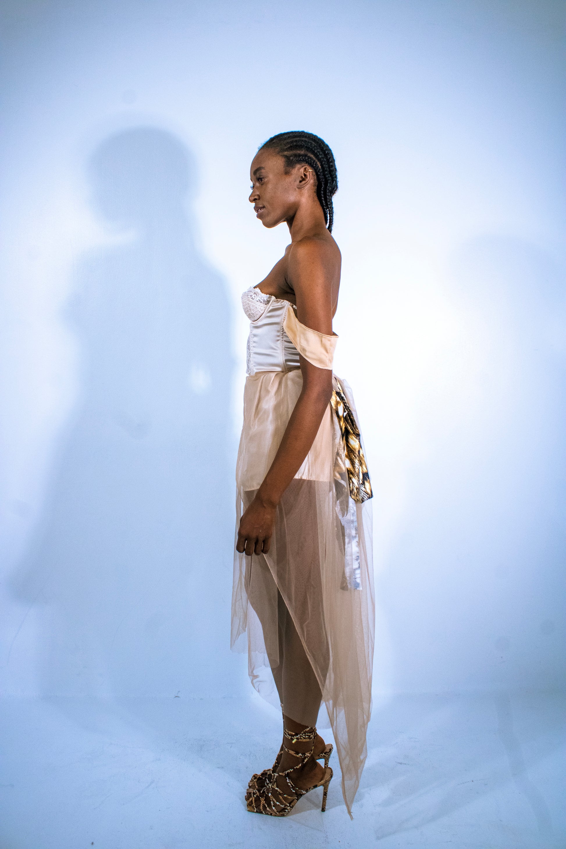 1of1 satin lace corset bodice with a silk charmeuse mini skirt & and layers of semi-transparent tulle, with draped champagne charmeuse sleeves
