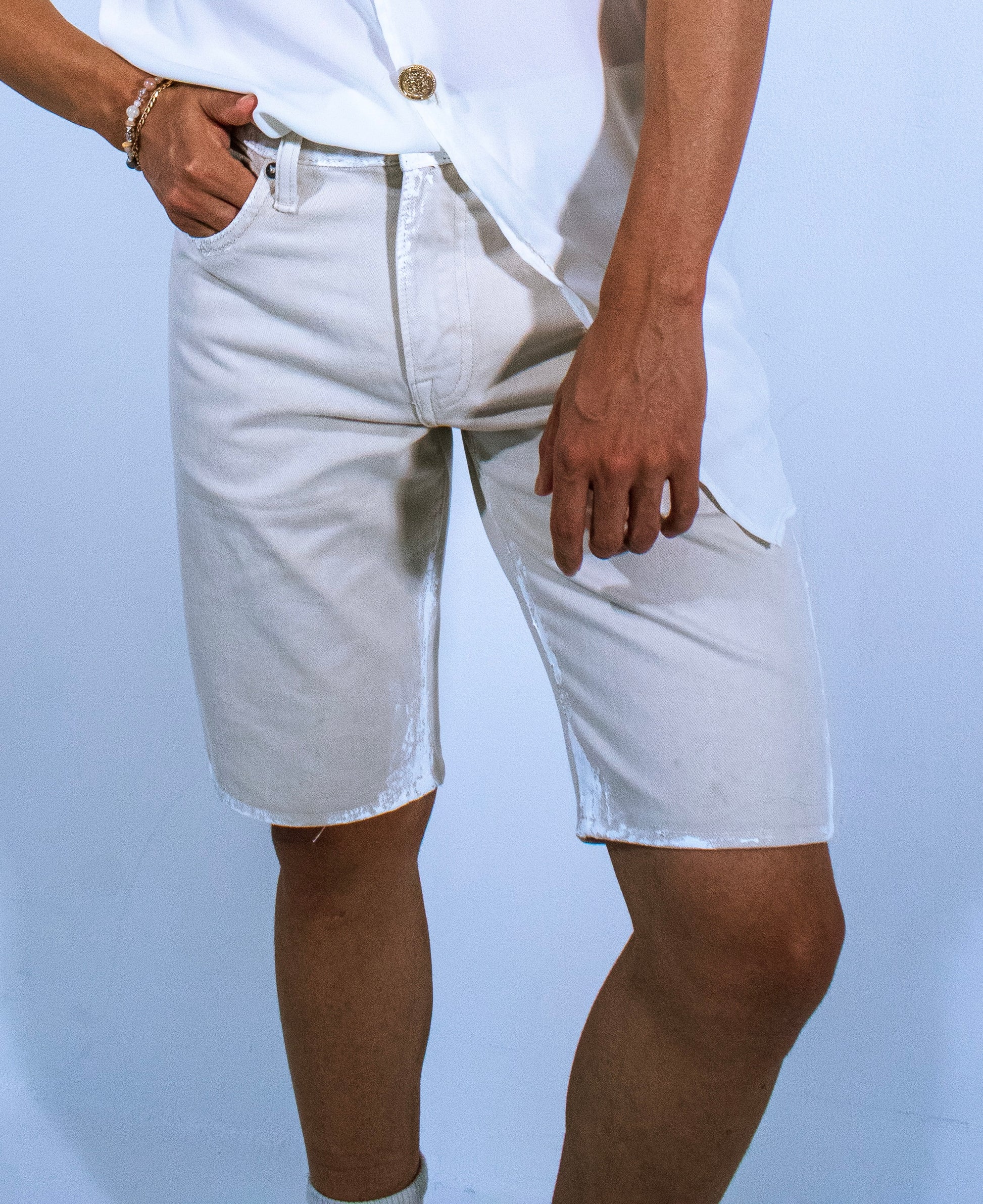 reworked GAP sandy beige denim jort, white paint detail on waist and seams